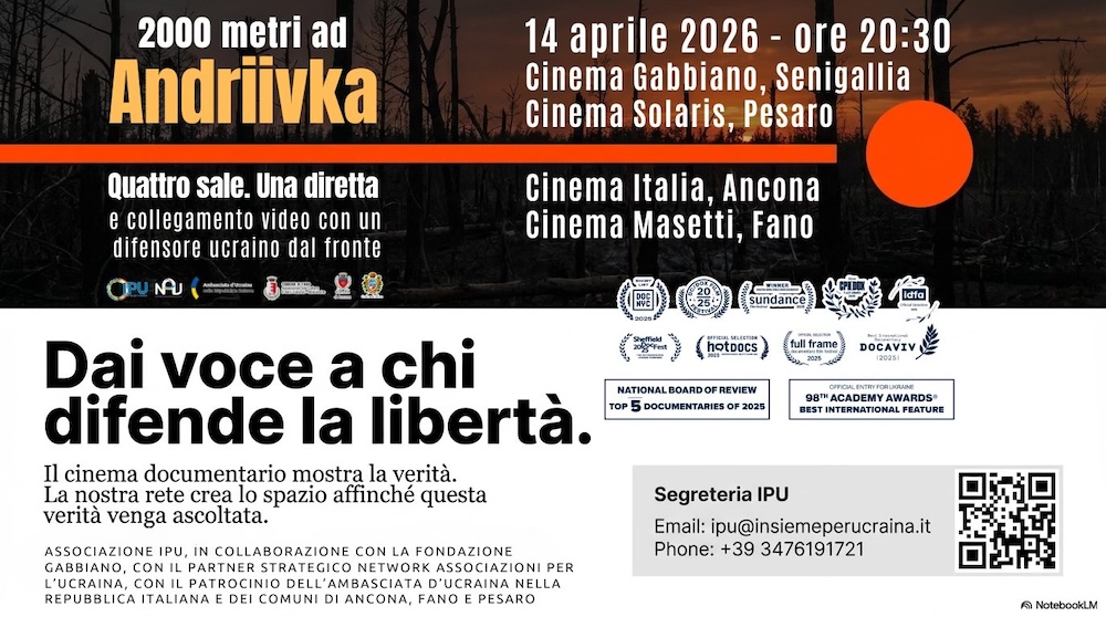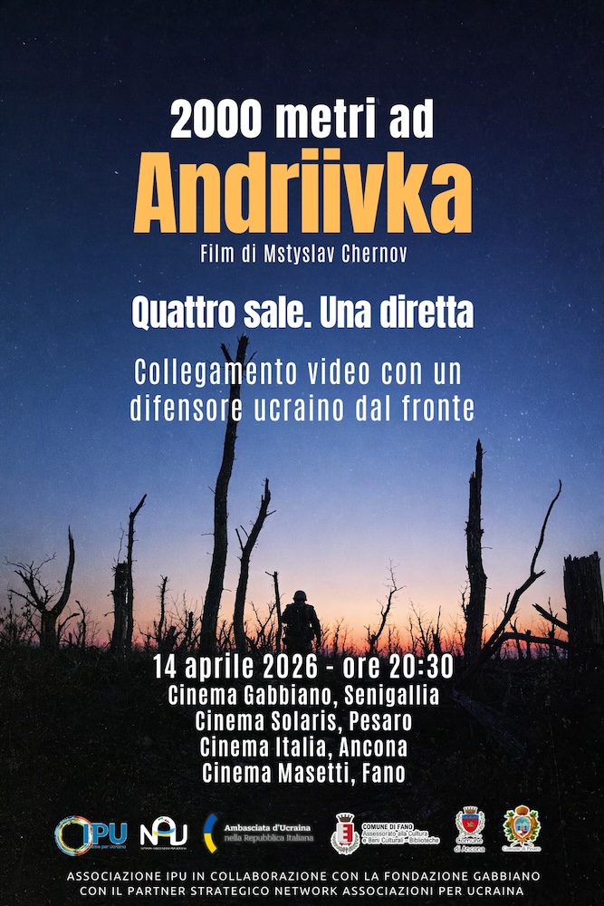 Quattro sale cinematografiche – Cinema Gabbiano di Senigallia, Cinema Solaris di Pesaro, Cinema Teatro Italia di Ancona e Cinema Masetti di Fano – sono state unite in uno stesso momento di attenzione, silenzio e verità attorno alla proiezione del film “2000 metri ad Andriivka” del regista ucraino Mstyslav Chernov.